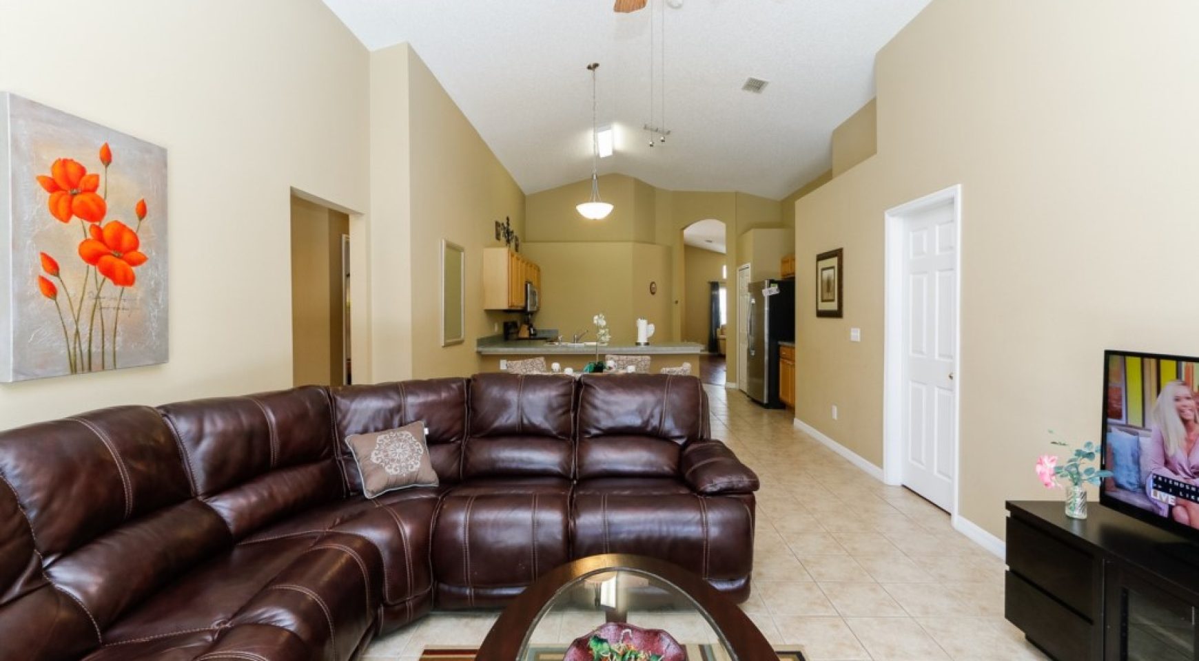 LIVING ROOM: This cozy living room is the perfect place to relax after a long day. You can relax on the comfortable leather sofas and take a nap or enjoy a good book. This contemporary living room has stylish leather sofas to relax on while enjoying the large screen TV and DVD/Blue-ray player.