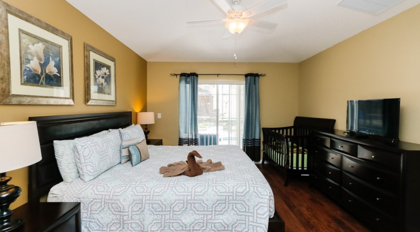MASTER SUITE 1: A beautifully furnished bedroom with king size bed, private bathroom, TV and baby cot.