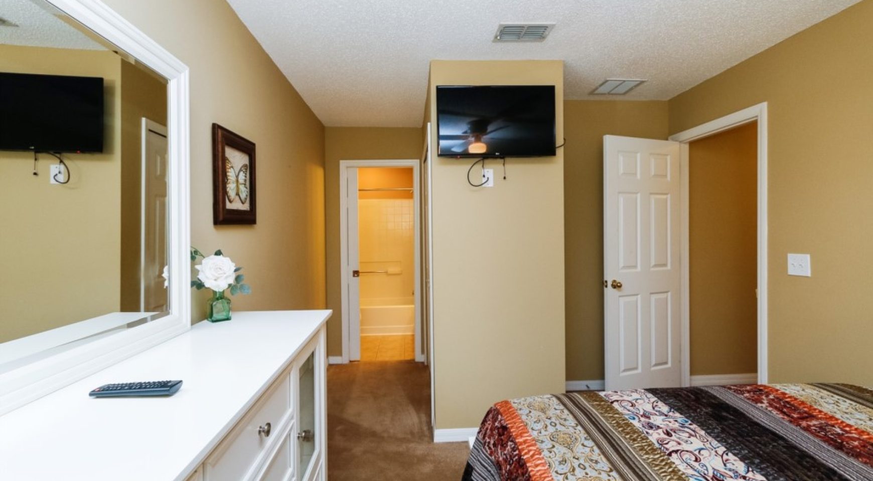 QUEEN 2 DORM: Excellently furnished and decorated room with queen size bed, private bathroom, TV and large dresser.