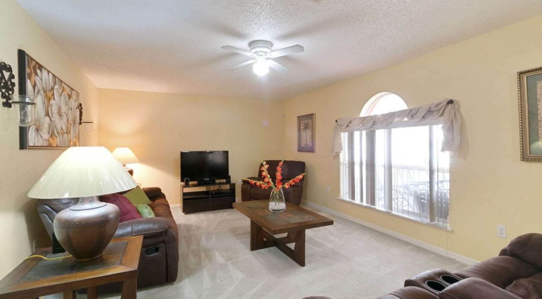 LIVING ROOM: the living room is spacious and cozy, furnished with your comfort in mind. Reclining sofas and loveseats, 42″ Samsung Smart TV and Samsung Blue-Ray DVD Player.