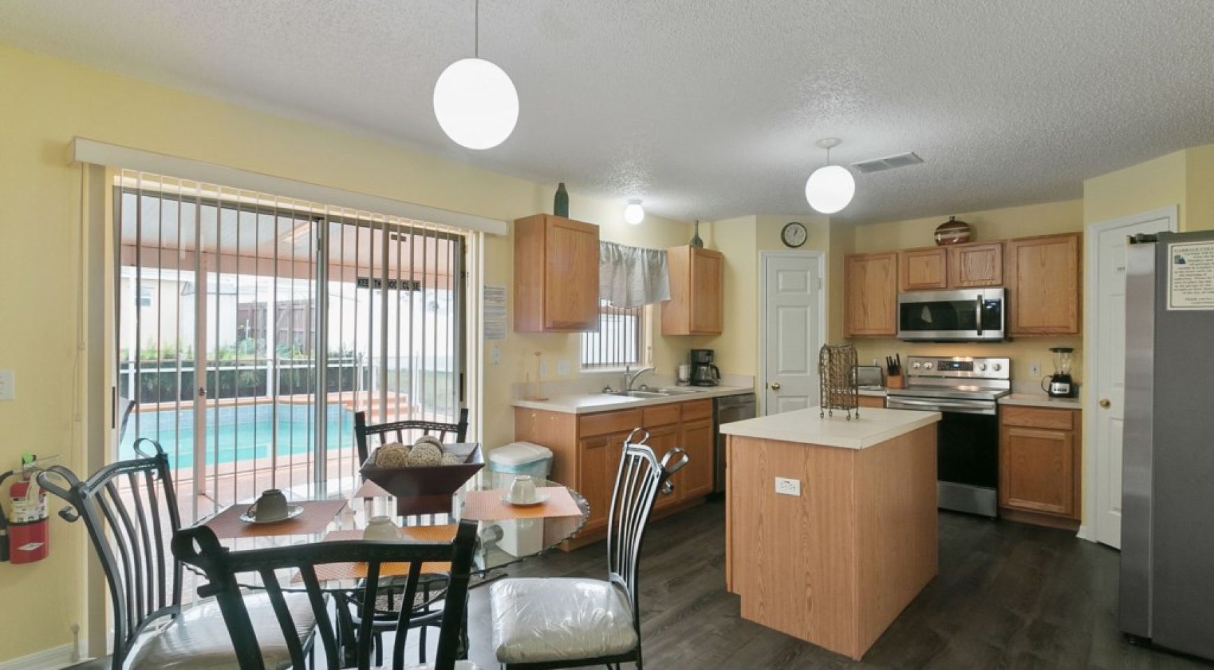 Beautiful breakfast nook with round table and four chairs overlooking the pool.