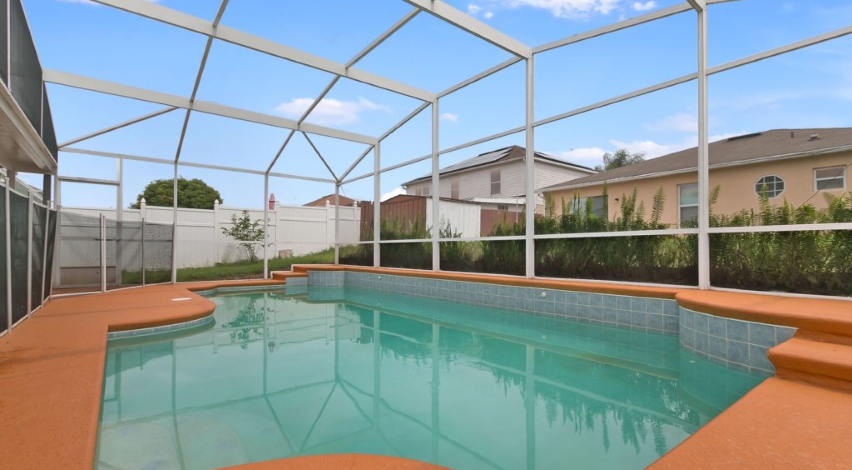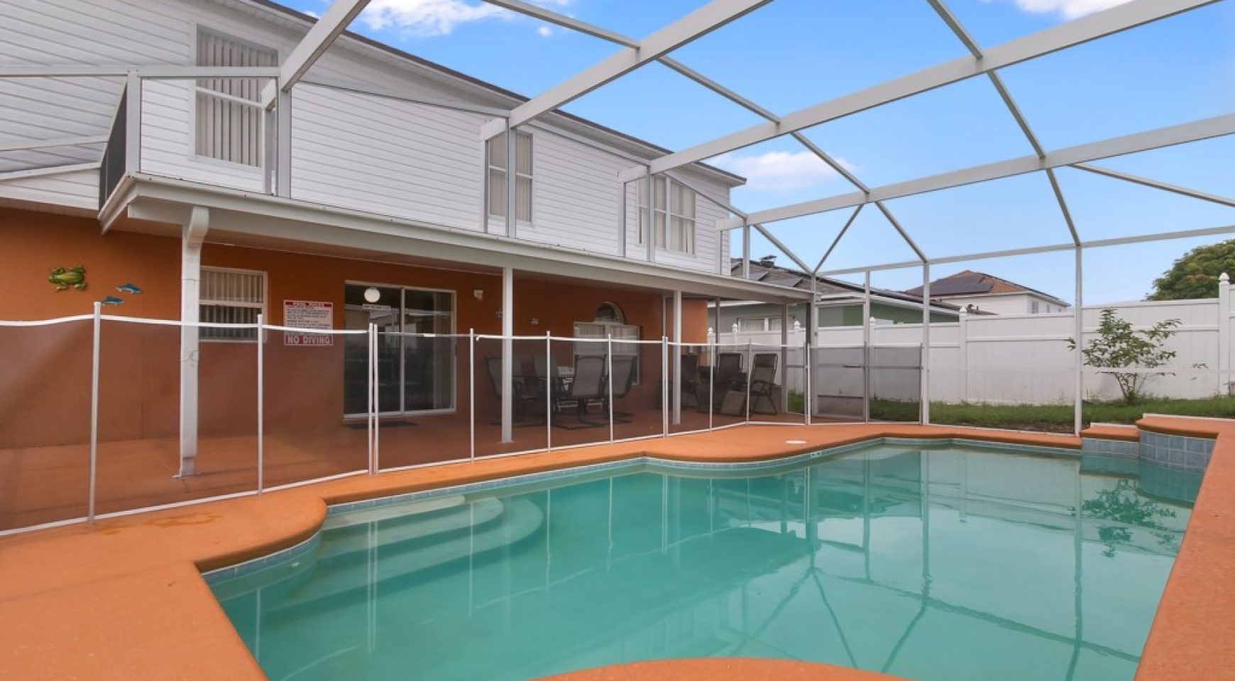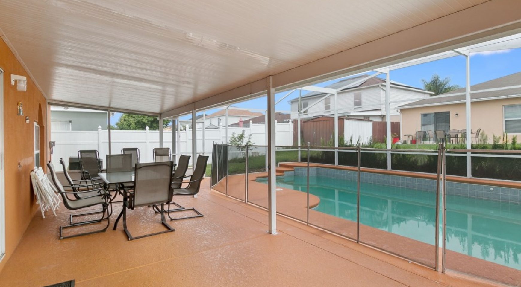 Fabulous pool that can be heated for an additional fee (check prices with our team) and large covered balcony. It also has a lovely dining set and lounge chairs.