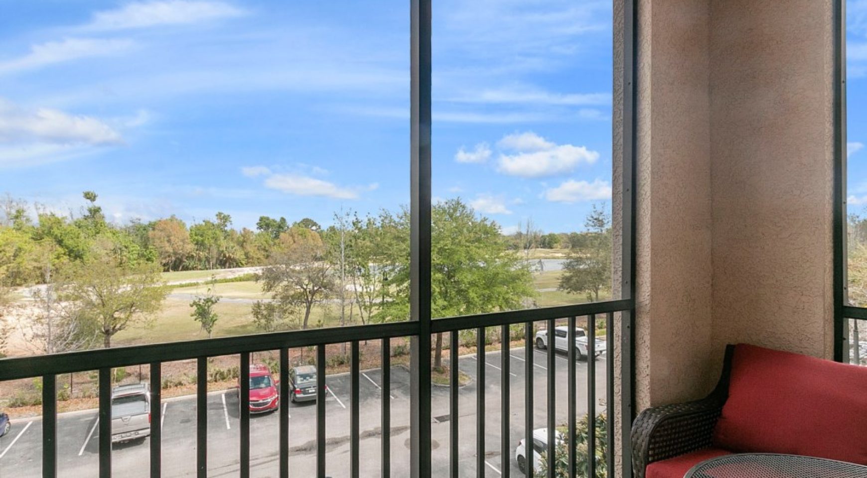 Cómodos asientos con vistas a uno de los campos de Reunion Golf Resort. ¡Disfruta de una bebida aquí en la tranquilidad de la noche o mira el espectáculo de fuegos artificiales del Epcot Center al final del día!