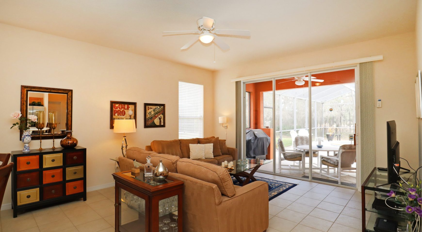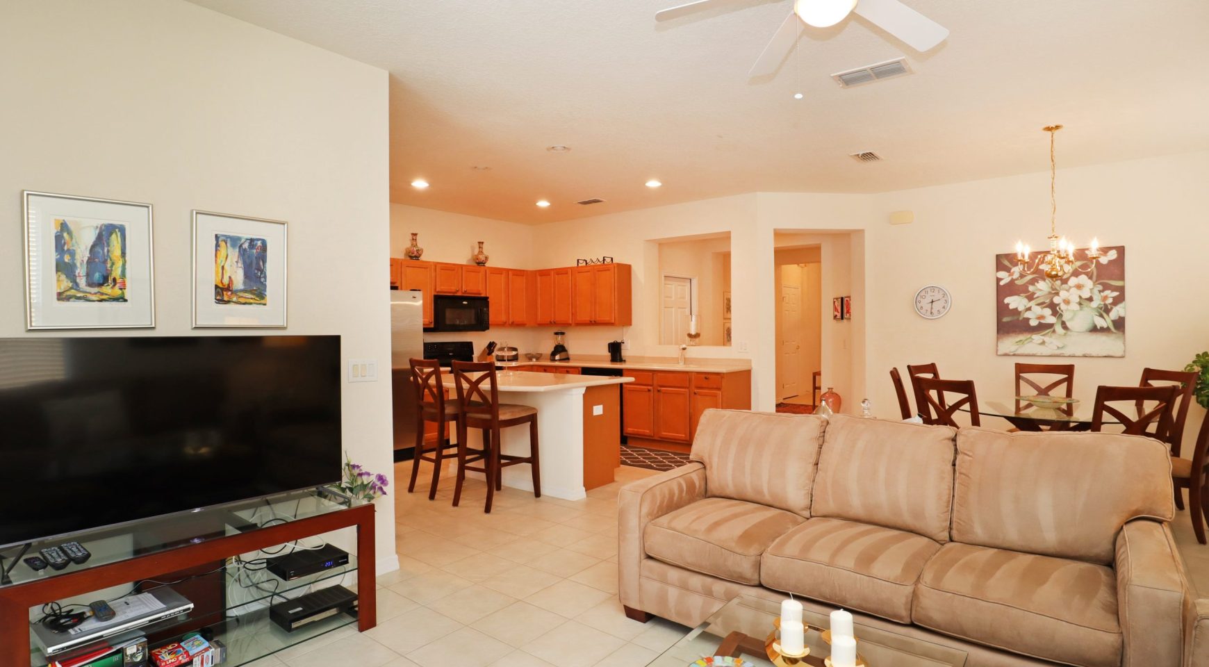 * SALA FAMILIAR: Acogedora habitación con cómodo sofá real, loveseat y sillón. 55″