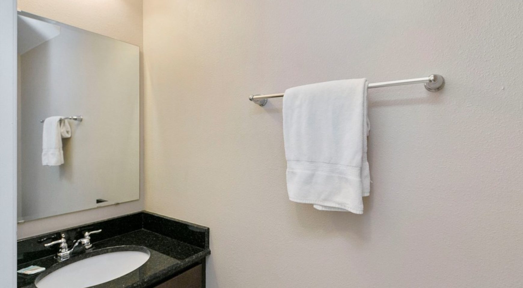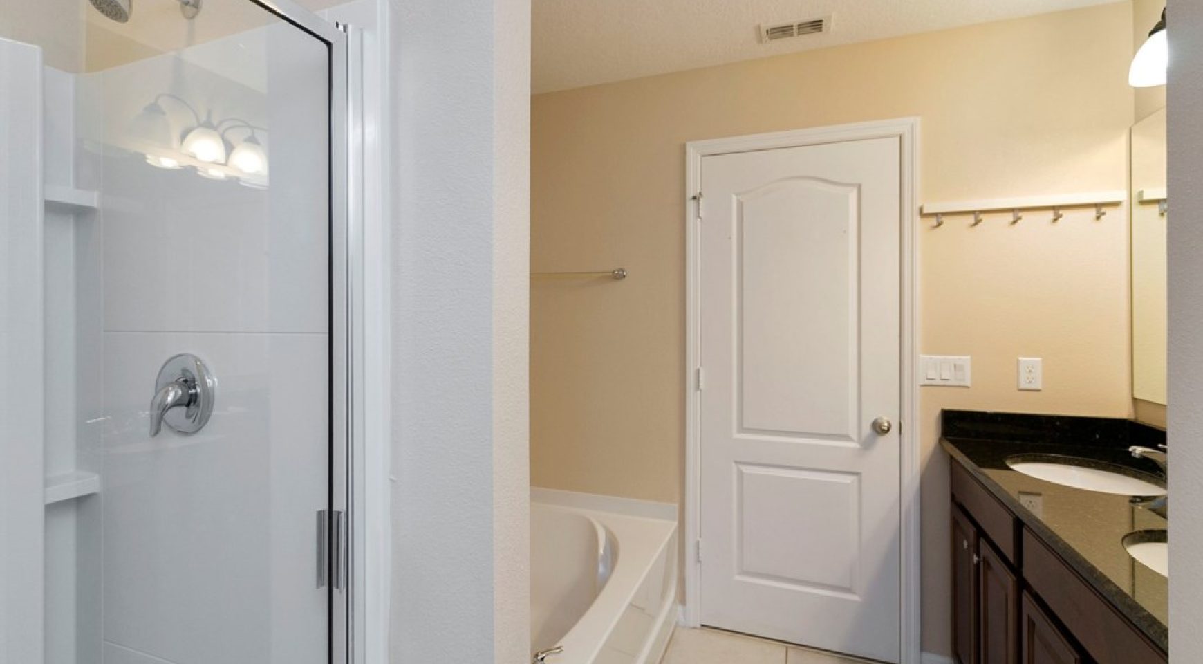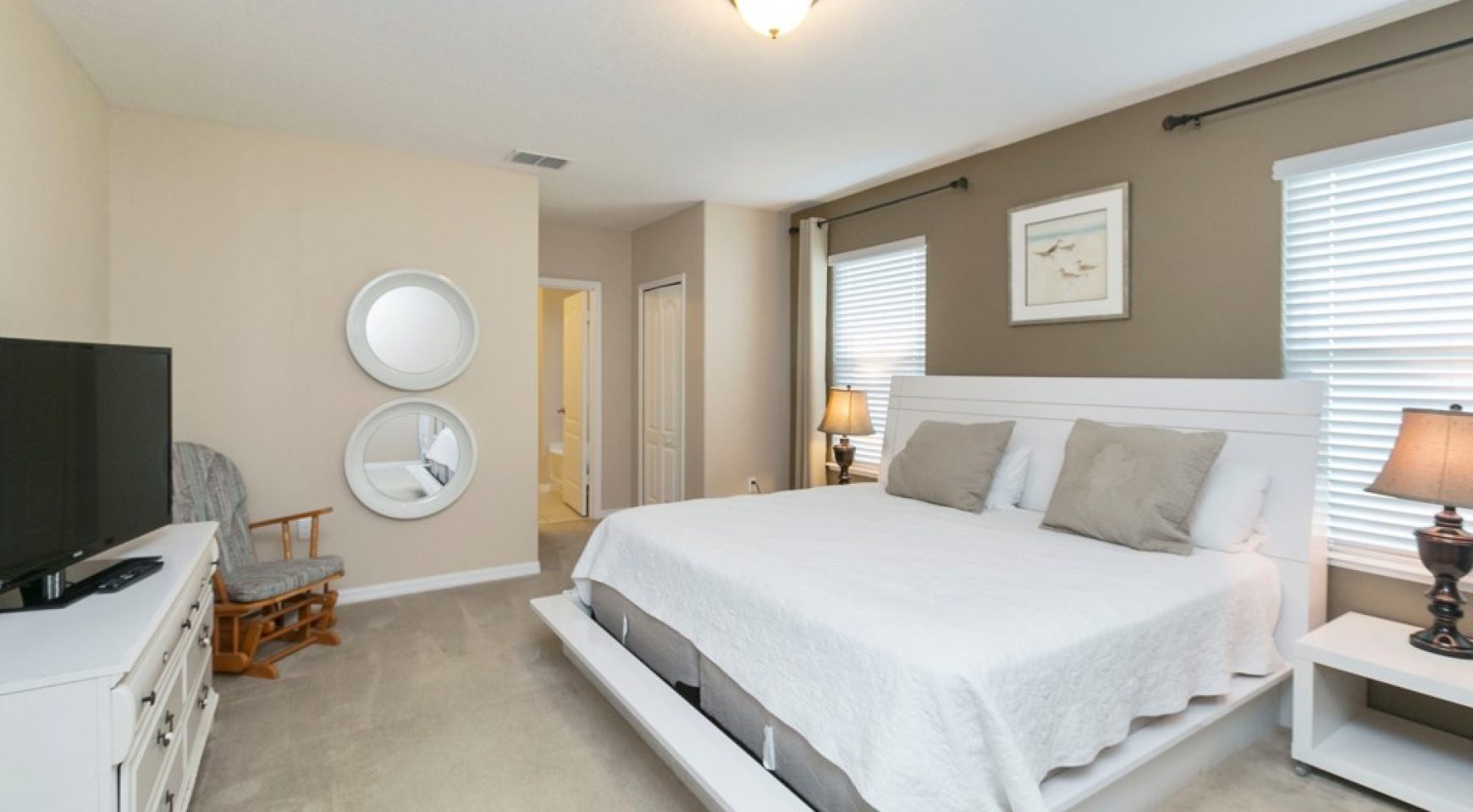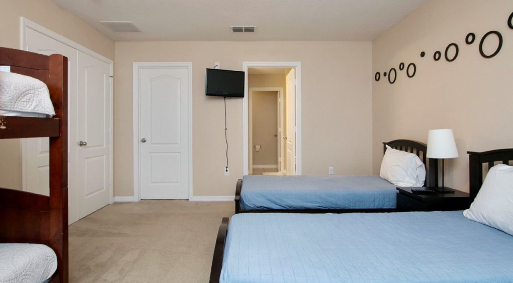 MASTER SUITE 2: O maior cômodo da casa com banheiro privativo! Equipado com três camas de solteiro e um beliche para as crianças quando todas elas querem estar juntas. Este quarto também possui armários de cabeceira duplos, um enorme closet e uma TV LCD Samsung de 32″. -no chuveiro, banheira elegante e pia dupla.